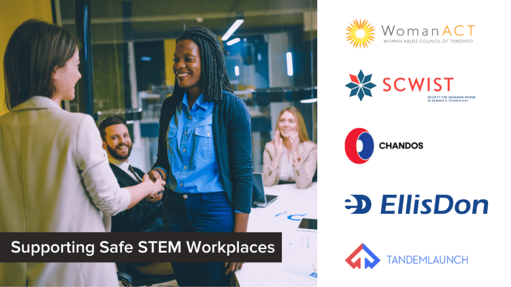 Toronto, ON: Today, WomanACT and The Society for Canadian Women in Science & Technology (SCWIST) are pleased to announce partnerships with three employers who are dedicated to creating workplaces free from sexual harassment: Chandos Construction, EllisDon, and TandemLaunch. The Department of Justice has funded WomanACT and SCWIST to provide custom support to STEM and trade employers to improve company-wide prevention and response measures that address gender-based and sexual harassment.