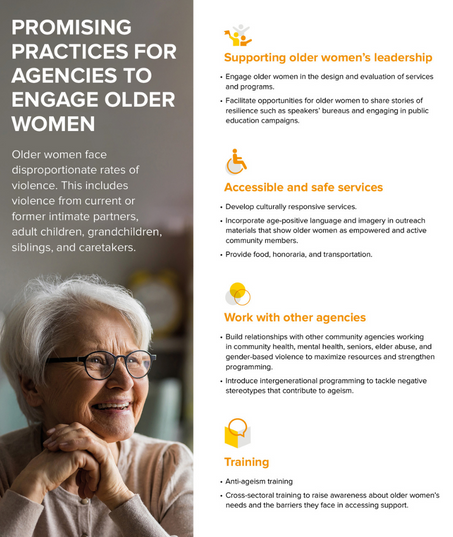 This infographic recommends strategies for agencies across sectors to build age-friendly and inclusive supports and services for older women experiencing violence.