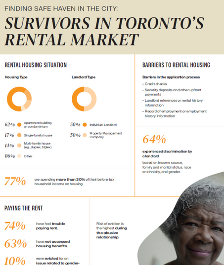 The infographic looks at the living conditions of survivors, financial limitations, and eviction related to gender-based violence and rental housing barriers.