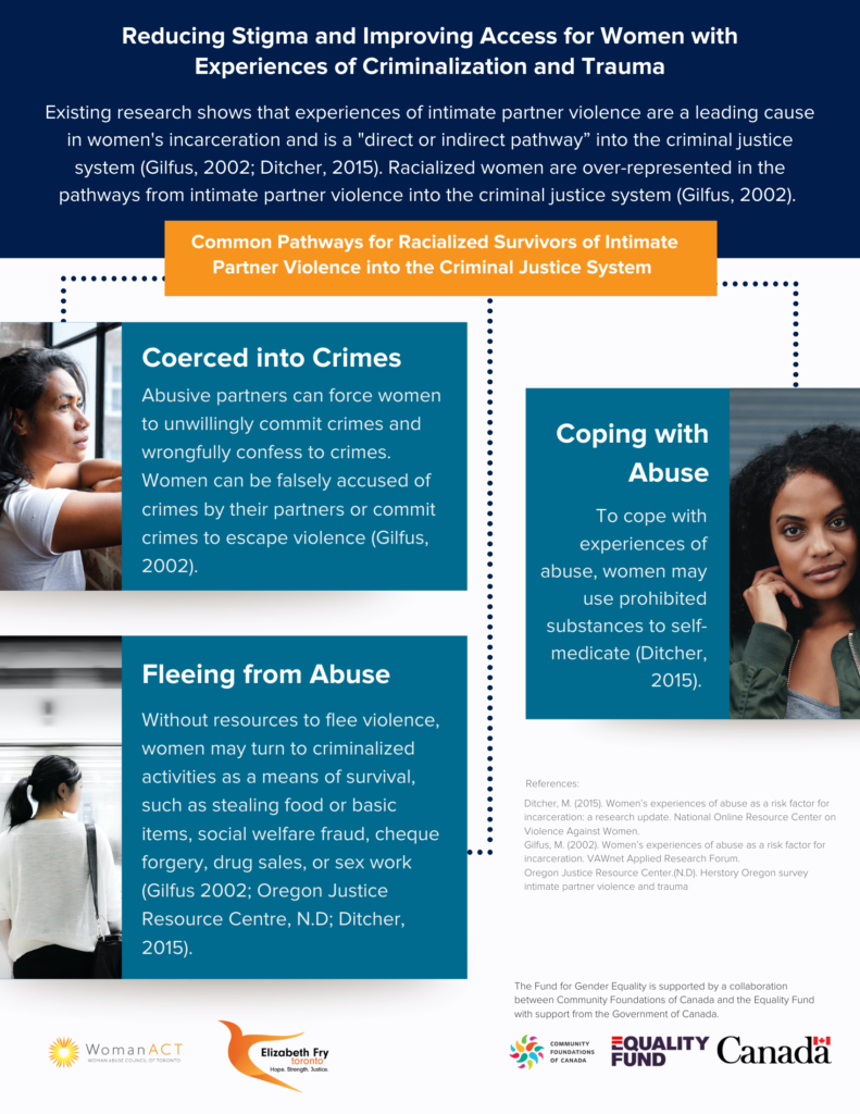 Research shows that experiences of intimate partner violence are a common pathway into the criminal justice system for survivors, especially racialized survivors. Women may be forced into criminal activities by partners or rely on criminal activities as a means of survival.