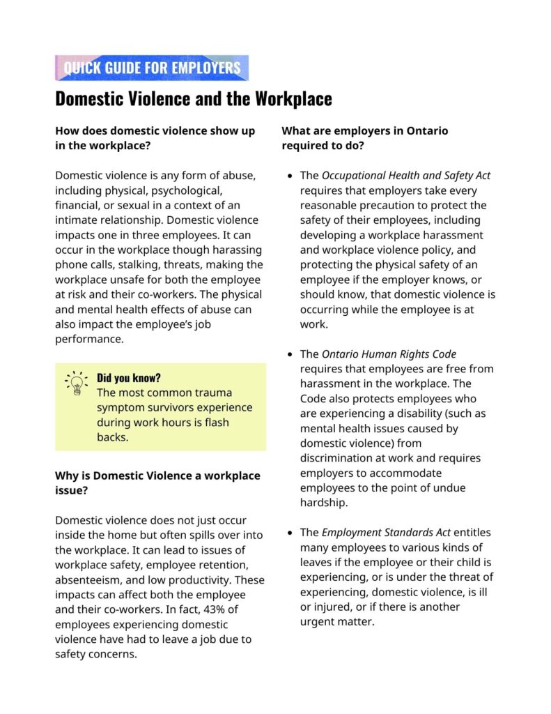 This quick guide for employers provides information on what employers in Ontario are required to do and highlights best practices for preventing and responding to domestic violence in the workplace.