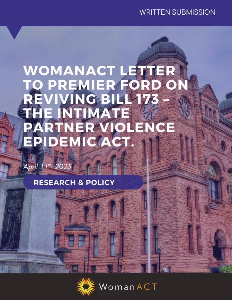 On April 11th , WomanACT submitted a formal letter to Premier Doug Ford and all Members of Provincial Parliament, calling for the revival and passage of Bill 173 — The Intimate Partner Violence Epidemic Act.