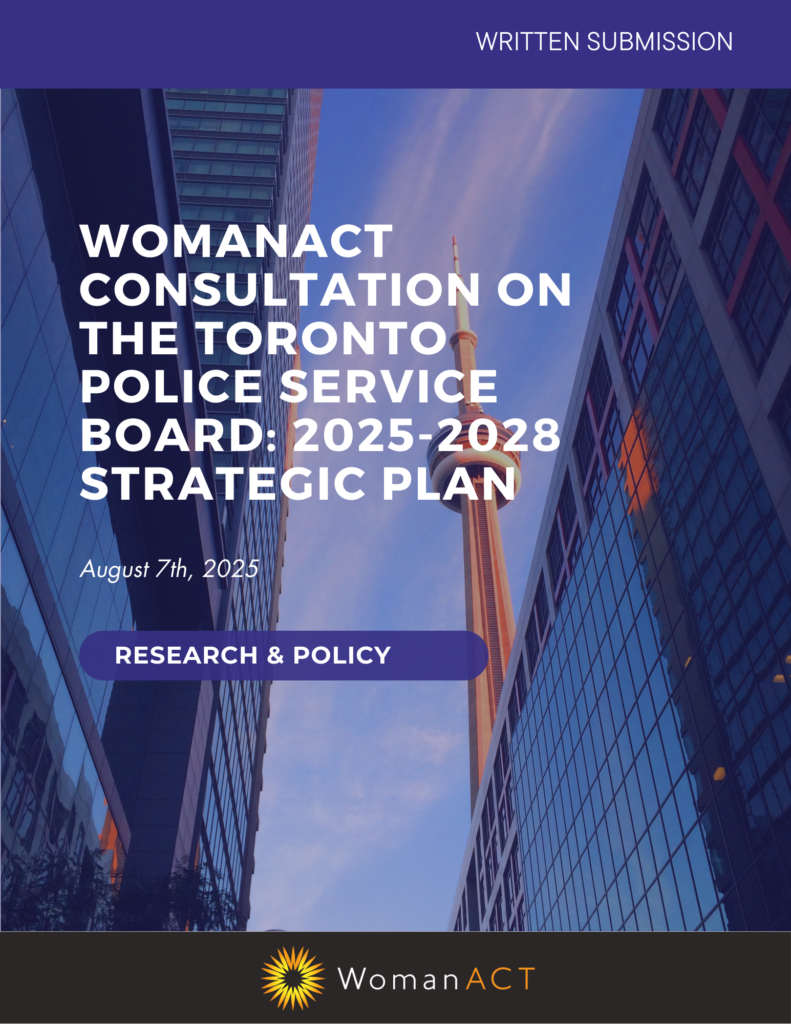 WomanACT’s feedback to the Toronto Police Service Board’s 2025–2028 Strategic Plan is the result of a collaborative process informed by the lived experiences and expertise of survivors, frontline organizations, researchers, and advocates across the violence against women (VAW) sector. Developed through consultations, both independently and as part of the City of Toronto’s IPV Working Group, this submission centers survivor voices and offers evidence-based, gender-responsive, and trauma-informed recommendations to address rising rates of intimate partner violence.